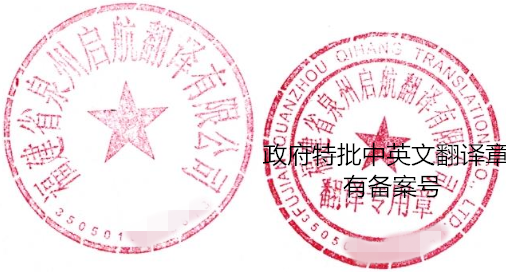 本公司中英文翻譯專用章[備案號(hào)No:350*0*00*33*1]經(jīng)公安部門特批備案,對(duì)加蓋“翻譯專用章”的各類司法文書、函件、證明書、涉外文件具有法律效力,所蓋“翻譯專用章”通行全球190多個(gè)國(guó)家和地區(qū)。各駐華使館、外交部、公安局出入境管理處、外匯管理局、公證處、車管所、教育部留學(xué)服務(wù)中心、司法機(jī)關(guān)、律師事務(wù)所、民政部婚姻登記處、房產(chǎn)局、勞動(dòng)和社會(huì)保障部、銀行、法院等部門廣泛認(rèn)可和承認(rèn) ,具有唯一性和權(quán)威性。