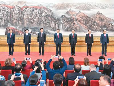 現在,我向大家介紹一下當選的其他6位常委同事:李克強同志、栗戰書同志、汪洋同志、王滬寧同志、趙樂際同志、韓正同志。其中,李克強同志是十八屆中共中央政治局常委,其他五位同志都是十八屆中共中央政治局委員,大家可以通過媒體渠道獲得更多有關他們的資料。